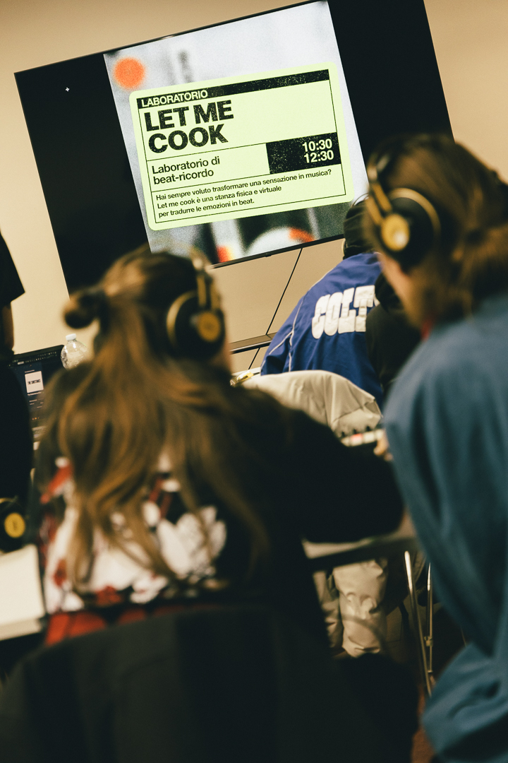 Let me cook è stato il primo evento della giornata: un laboratorio immersivo con l’obiettivo di accompagnare ogni partecipante alla costruzione di un beat originale personalizzato a partire da un ricordo o un’emozione, con l’obiettivo di avvicinare anche i non professionisti a un assaggio della vita quotidiana di chi si occupa di music production.